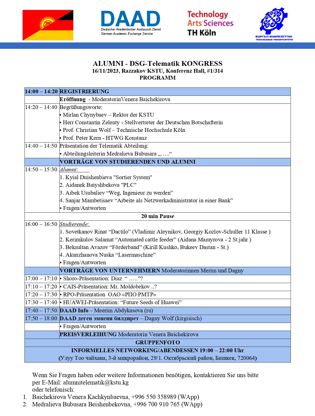 ALUMNI-конгресс DSG-Telematik состоялся 16 ноября 2023 года в КГТУ им. И. Раззакова. Мероприятие объединило выпускников, студентов, преподавателей и представителей компаний-партнёров с целью обмена опытом, обсуждения карьерных траекторий и современных инженерных решений.